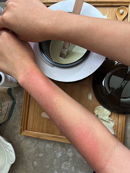 看一下狀況如何!就可以把溫度調到中間攪拌一下,出現這樣的狀態就可以調中溫嘍