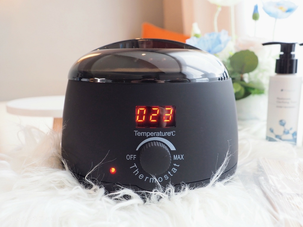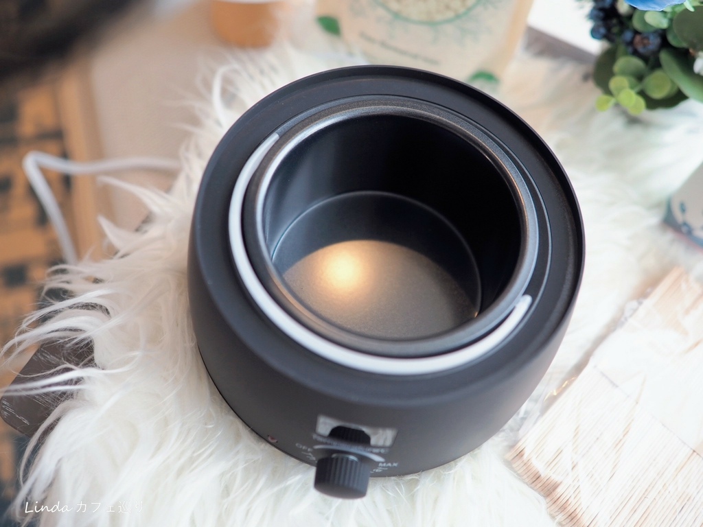 《FUgood膚之呵護》熱蠟機質感蠻好的,旋轉就可以調整溫度,重點是螢幕上都有顯示目前溫度,機身恆溫加熱不用等很久,差不多 20-25 分鐘等熱蠟融化後,就可以用木棒確認熱蠟的狀態。