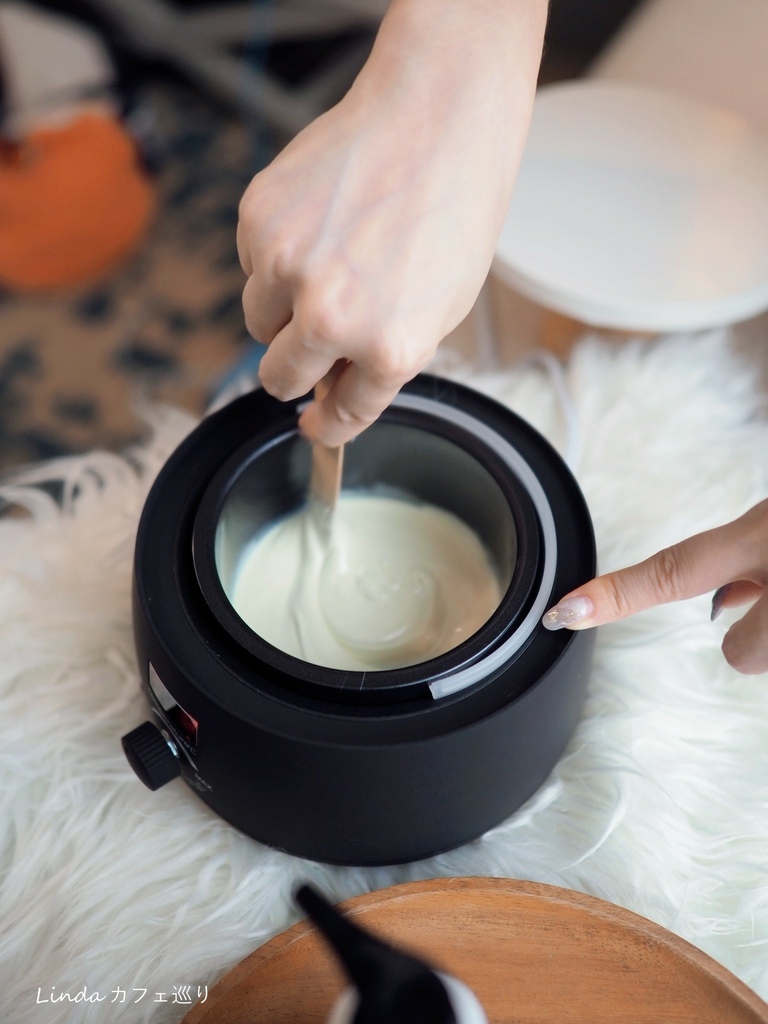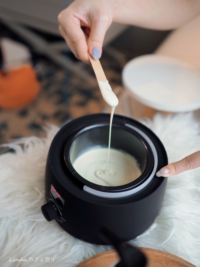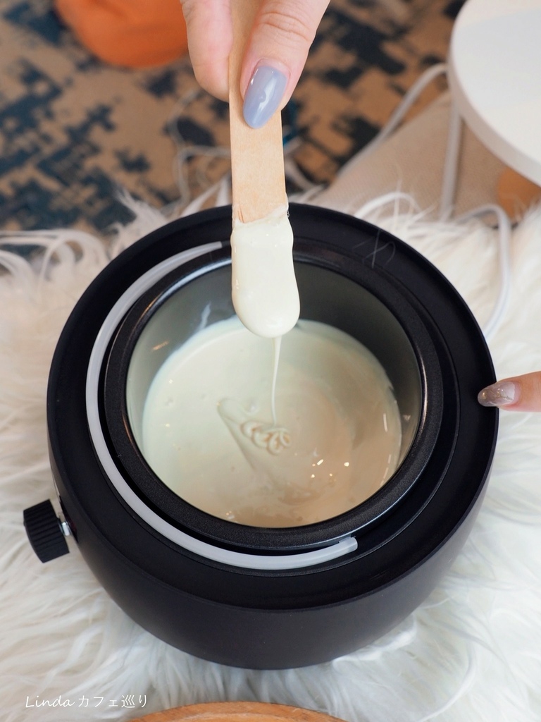 這時候熱蠟加熱的差不多,直接塗抹於想要除毛的部位,我就是手毛、大腿毛,小腿跟腋下之前已經雷射除完,幾乎是沒什麼毛髮了。