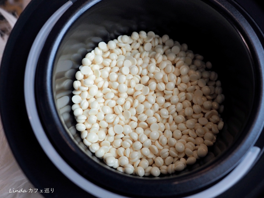 這次先試玩了一下發現蠻好上手的,先倒入一些熱蠟進入鍋中,蠟豆至少要鋪平看不見鍋底