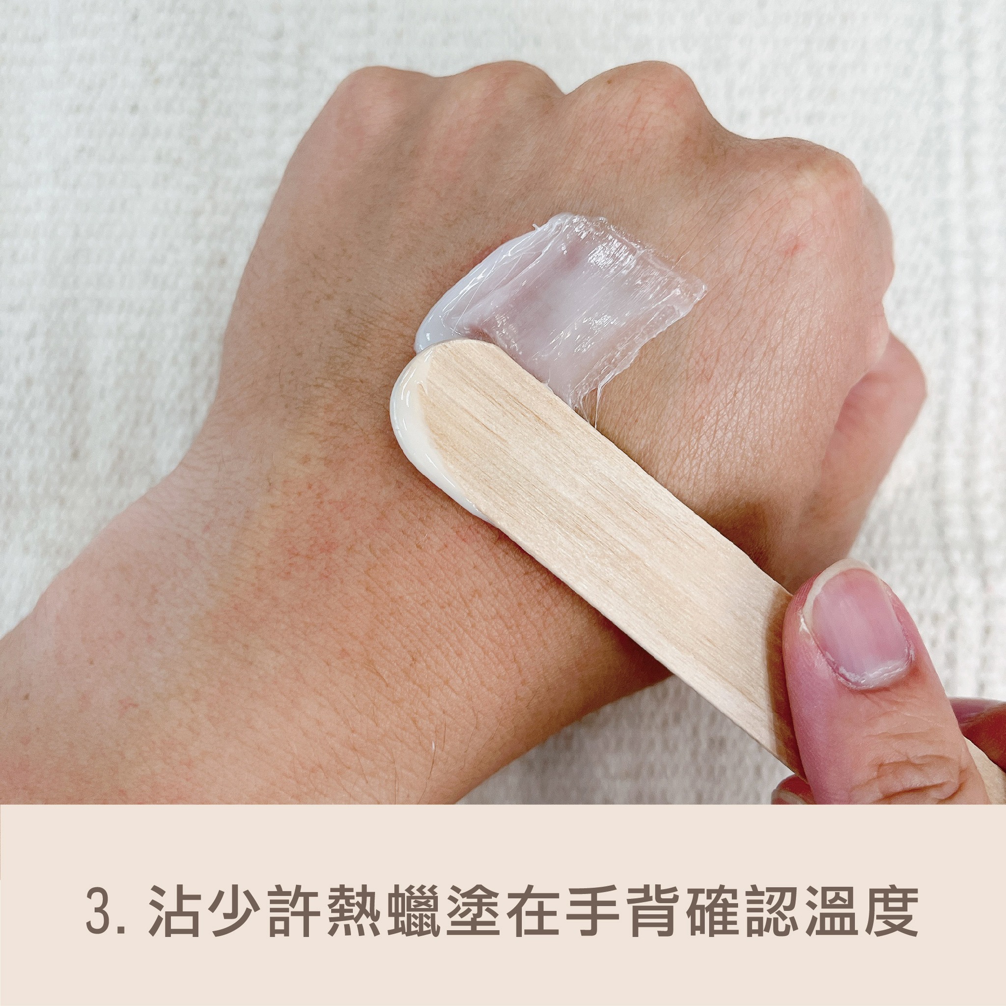 3、除毛前再用木棒沾取少許熱蠟塗在手背上確認溫度,溫溫不燙即可使用