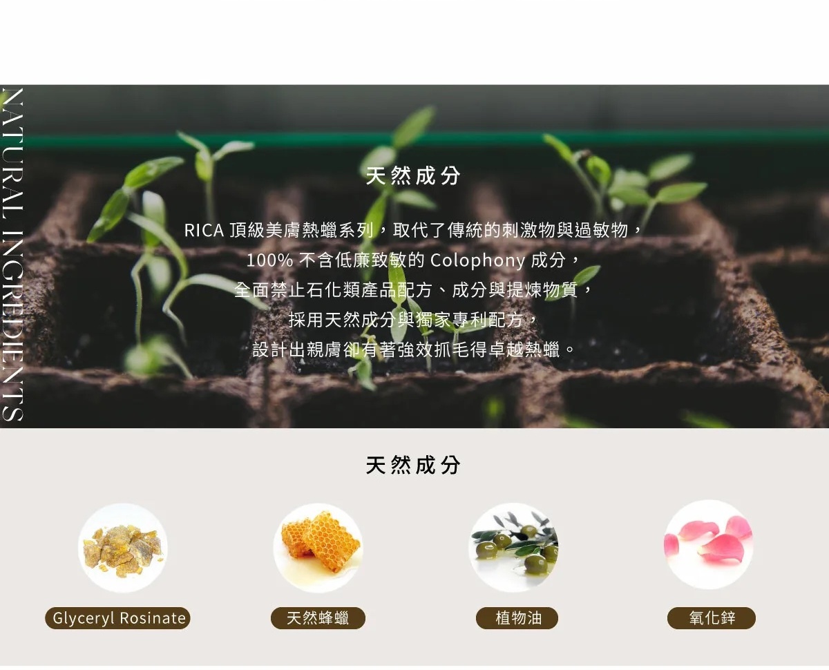 • 淘汰一般常見的石油提煉成分,專利配方植物油讓熱蠟緊附毛髮時,肌膚扔保有舒適度。